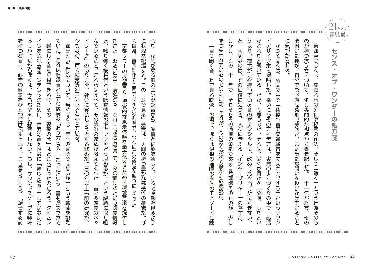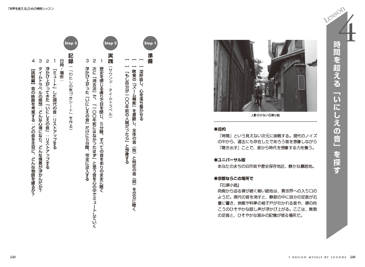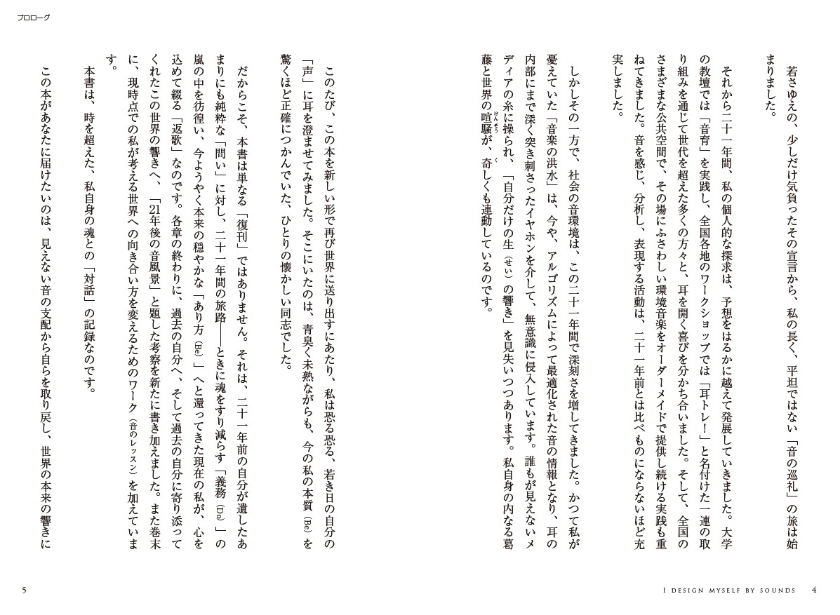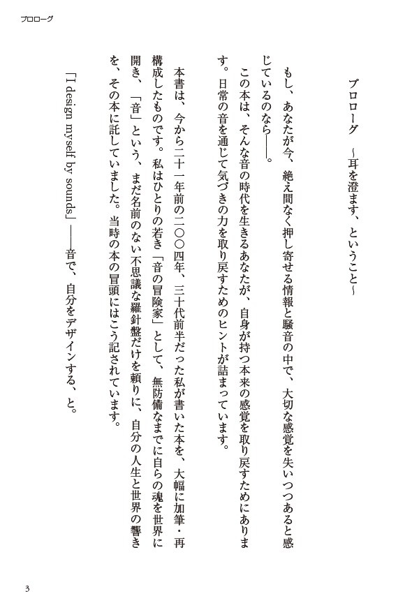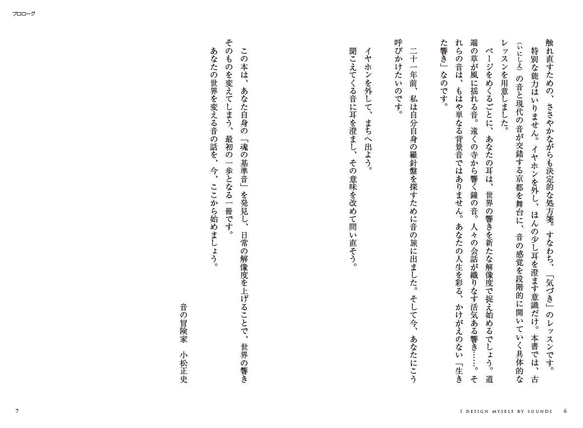 「この本があなたに届けたいのは、見えない音の支配から自らを取り戻し、世界の本来の響きに触れ直すための、ささやかながらも決定的な処方箋。すなわち、「気づき」のレッスンです。 特別な能力はいりません。イヤホンを外し、ほんの少し耳を澄ます意識だけ。本書では、古(いにしえ)の音と現代の音が交錯する京都を舞台に、音の感覚を段階的に開いていく具体的なレッスンを用意しました。 ページをめくるごとに、あなたの耳は、世界の響きを新たな解像度で捉え始めるでしょう。」( 「プロローグ」より)